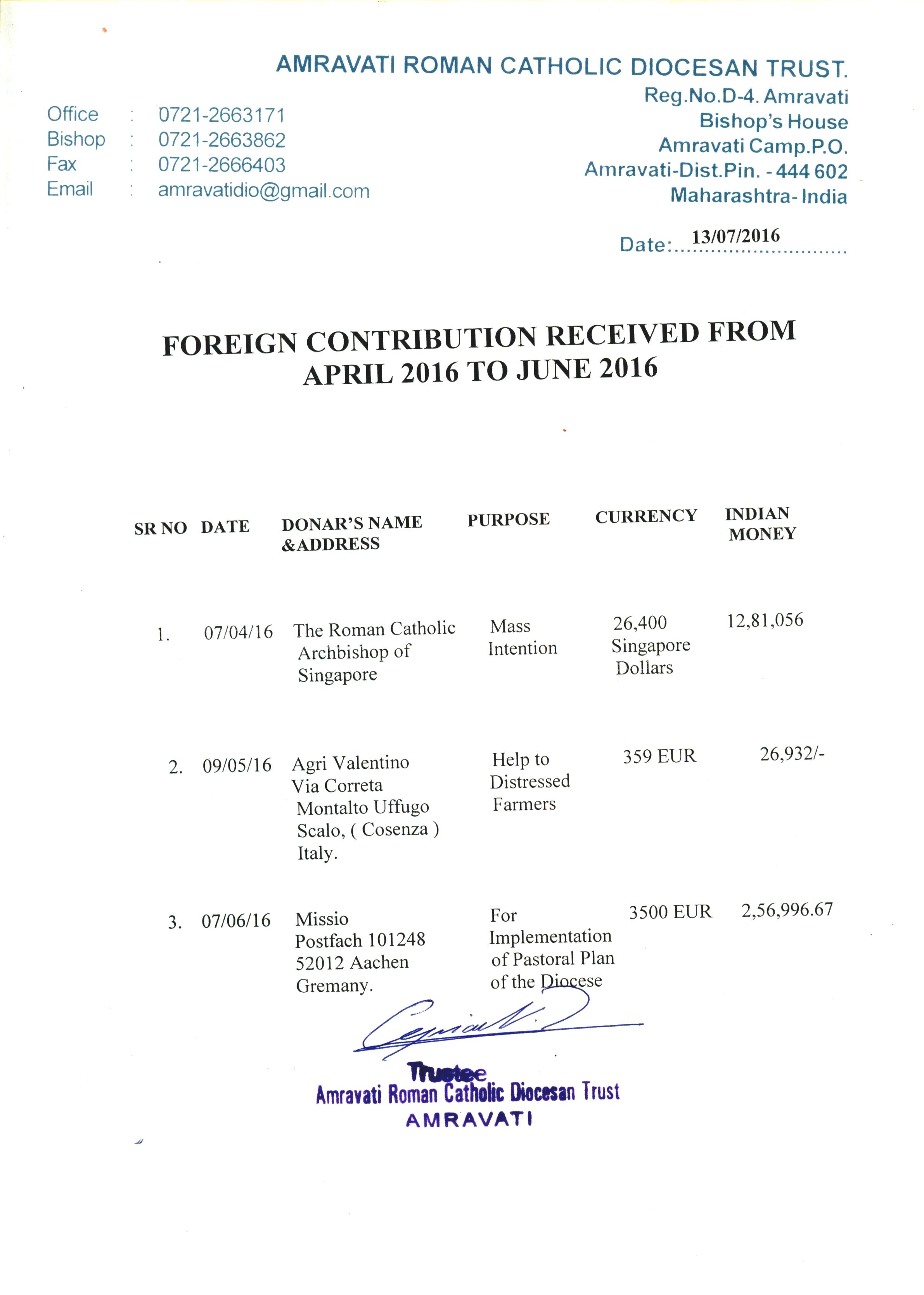 Donations April 2016 - June 2016
